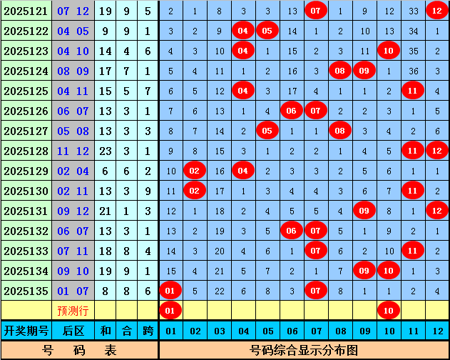 后区分析:上期后区开出奖号01、07,为一大一小、全奇组合。