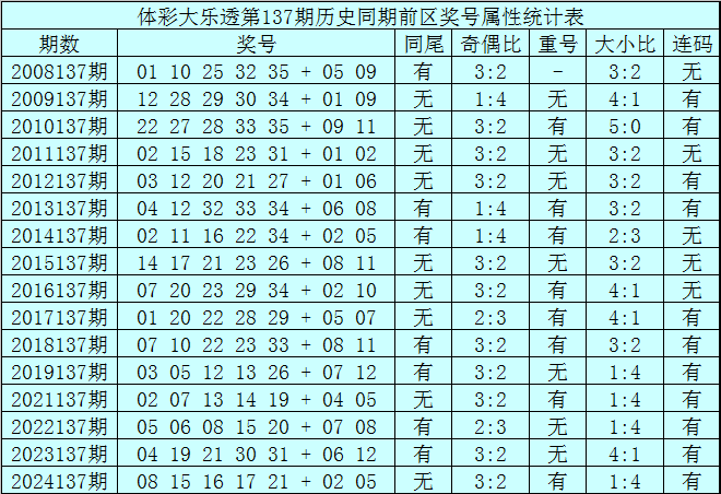 体彩大乐透第137期历史同期开出16次奖号,其统计详见下表: