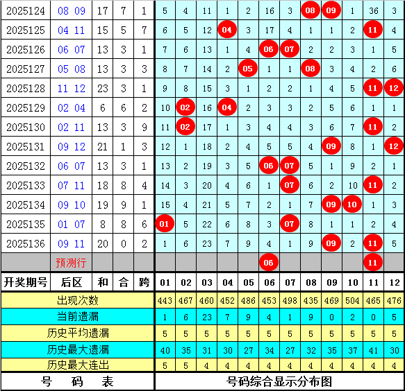 和值跨度:上期和值开出72,对比第2025135期和值下降了16个点位,本期看好和值走小,关注小 号区域和值,预计在69附近。