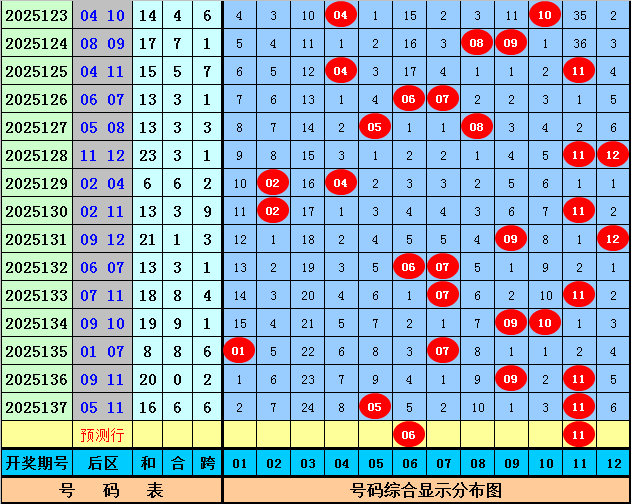 后区分析:在第138期历史同期开奖中,后区奖号一奇一偶出现10次,全奇出现3次,全偶出现3次,今年第138期后区预计出现一奇一偶组合,看好两码06和11。