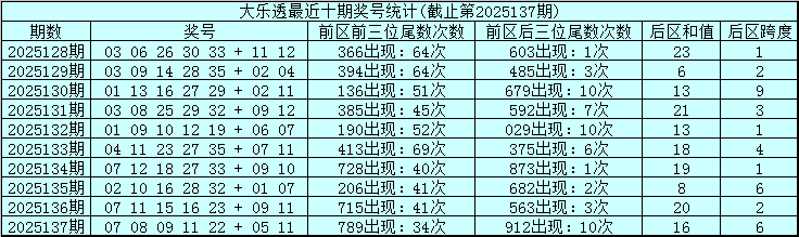 体彩大乐透第25137期奖号开出:07 08 09 11 22+05 11,前区奖号大小比为1:4,012路比为1:2:2,奇偶比为3:2,后区号码和值为16,跨度为6。