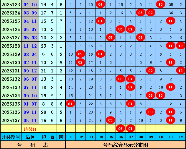 后区号码分析:上期后区开出奖号05 11,和值为16,跨度为6,本期后区参考号码01、03、06、07、10。