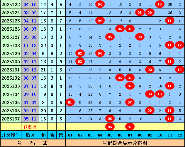 大乐透第2025137期开奖号码为:07、08、09、11、22+05、11。其中前区奖号首尾间距为15,和值为57,奇偶比为3:2,大小比为1:4。