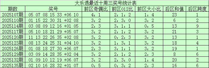 前区奇偶走势:上期前区奇偶比为3:2,上周三前区奇偶比0:5,最近十周三奇偶号码走势基本平衡,本期预计奇数号码转热,关注奇偶比3:2。