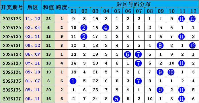 前区重号分析:上期开出2个重号,近十期5期开出重号,重号走势一般。近49期重号开出23期,开出比例为46.9%,本期预计重号11出现。