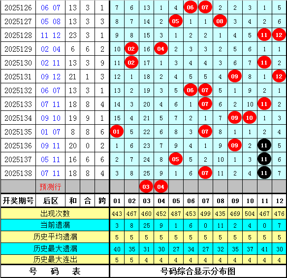 和值跨度:上期和值开出67,对比第2025137期和值上升了10个点位,本期看好和值走小,关注小 号区域和值,预计在59附近。