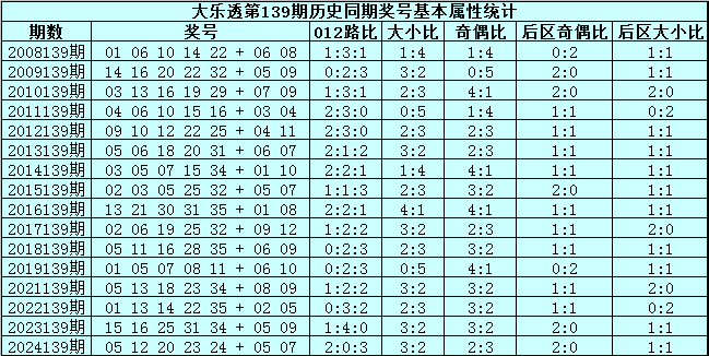 后区推荐:第139期历史同期后区奇偶比总比例为19:13,偶数表现较冷,本期防止回补,关注一奇一偶组合开出,看好两码03、08。