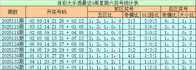 上期回顾:体彩大乐透上周星期六(第2025136期)奖号为07 11 15 16 23 + 09 11,前区奖号五区比为1:1:2:1:0,奇偶比为4:1,012路比为1:2:2,后区奖号奇偶比为2:0,大小比为2:0。
