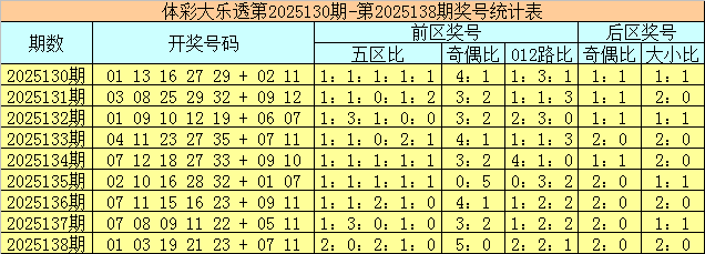 体彩大乐透第2025138期奖号为01 03 19 21 23 + 07 11,前区号码五区比为2:0:2:1:0,奇偶比为5:0,012路比为2:2:1,后区号码奇偶比为2:0,大小比为2:0。