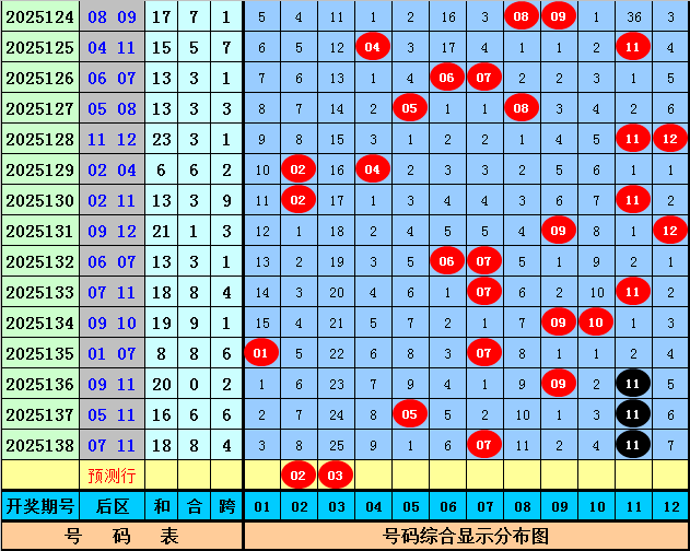 后区奖号分析:上期后区开出奖号07+11,奖号和值为18,跨度为4,本期预计后区和值转小,关注两码02 03。