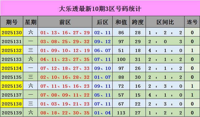后区开出号码01、04落在1区。最近50期,一区(1-4)开出号码31个,二区(5-8)开出号码35个,三区(9-12)开出号码34个,2、3区号码较热,1区较温,本期推荐关注:05、10