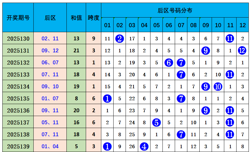 一区(01-12):上期开出1个号码,最近10期该区开出22个号码,出号较热,本期预计会开出1个奖号,推荐奖号05。