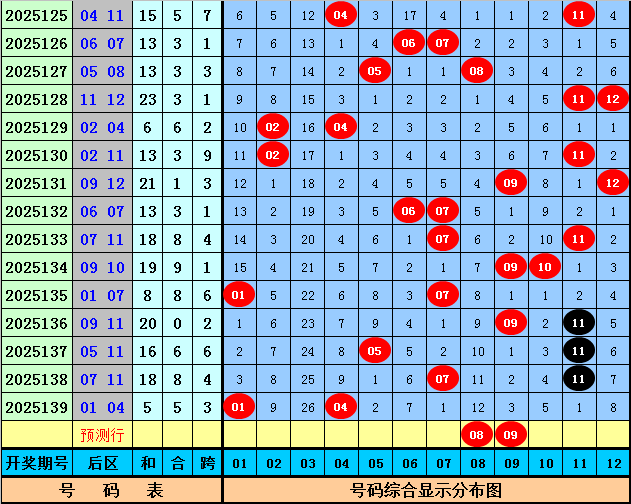 后区分析:上期后区为一奇一偶号码01+04,最近10期后区号码奇偶比为15:5,最近50期后区奇偶比为50:50,本期后区参考一奇一偶组合,关注两码08、09。