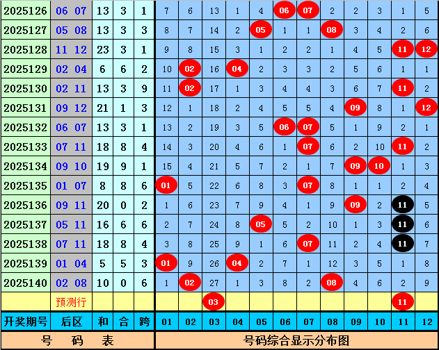 012路分析:上期前区奖号012路比为1:3:1,最近两周1路前区奖号走势较热,0路前区奖号表现较冷。