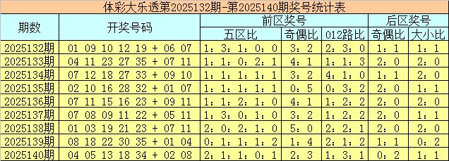 体彩大乐透第2025140期奖号为04 05 13 18 34 + 02 08,前区号码五区比为2:1:1:0:1,奇偶比为2:3,012路比为1:3:1,后区号码奇偶比为0:2,大小比为1:1。
