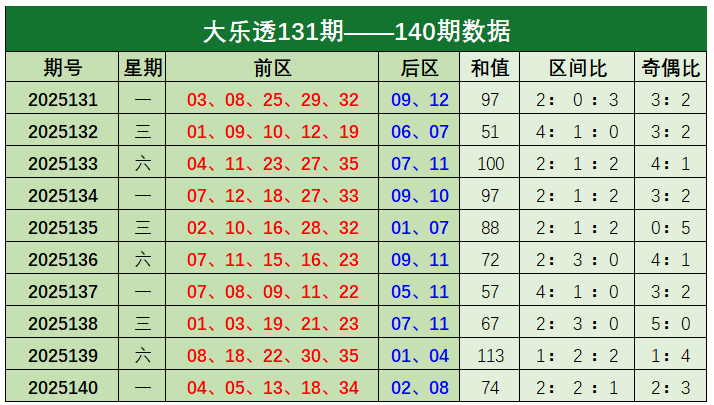 大乐透第2025140期出奖号统计:前区04、05、13、18、34,后区02、08。和值为74,区间比为2:2:1,奇偶比为2:3。