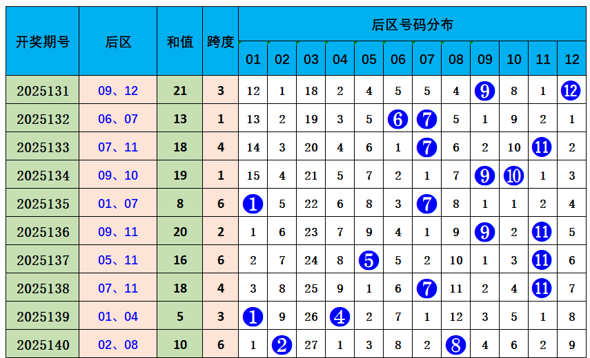 上期奖号开出02、08。最近10期开出大奖号15枚,小奖号5枚,大小比为15:5,本期预测开出大小比为1:1,推荐后区奖号:01、10。