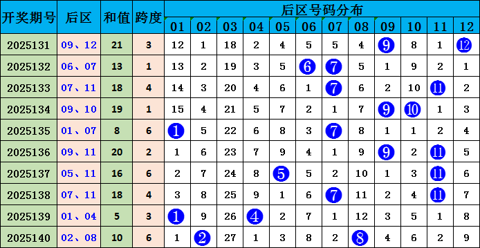 后区分析:大乐透后区上期开出偶偶组合,跨度6。近10期后区奇偶组合出现3期,偶奇组合出现1期,奇奇组合出现5期,偶偶组合出现1期;近10期后区两码跨度1-5开出7次,6-11开出3次,本期后区两码综合推荐:04、09。