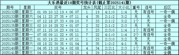 大乐透第2025141期奖号为:04、09、24、28、29+02、10。其中前区三区比为2:0:3,大小比为3:2,包含1个重号,包含连号,后区为全偶号码。