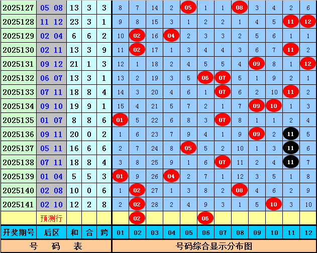 后区分析:上期后区为全偶号码02+10,最近10期后区号码奇偶比为13:7,最近50期后区奇偶比为48:52,本期后区关注全偶组合,看好号码02、06。