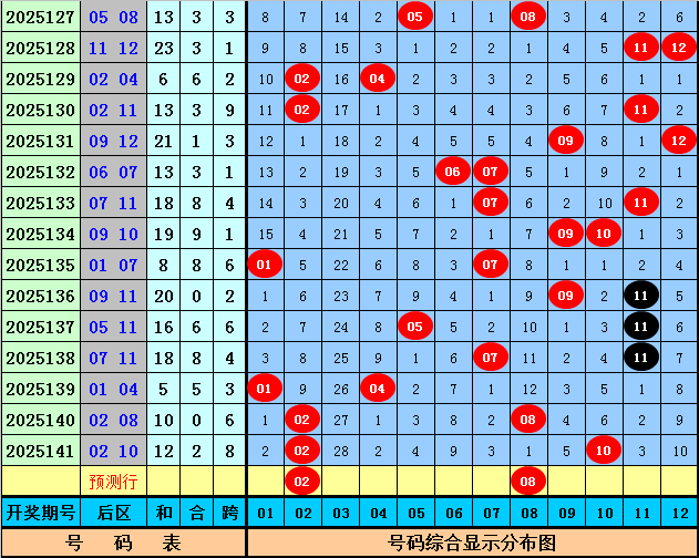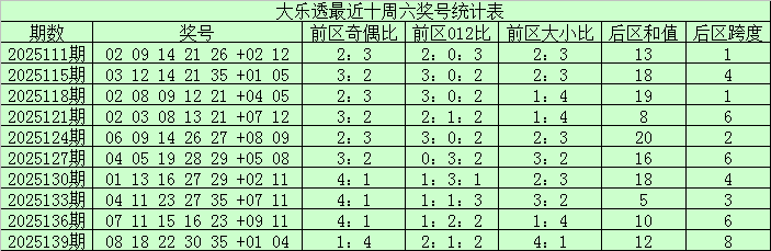 后区分析:上期后区奖号为02+10,开出一大一小组合,上周六后区奖号开出01+04,最近十周六后区奖号大小比为11:9,大小 号码走势基本相当,本周六看好大小 号码继续平衡,关注两码02、08。