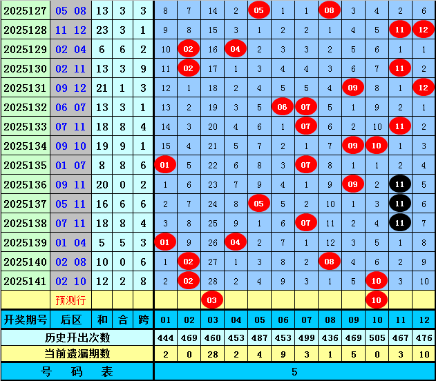 后区分析(定义:01-04为一区,05-08为二区,09-12为三区):上期后区开出奖号02和10,分别出现在第一区和第三区和区,最近10期后区三个区间落号个数比为5:7:8,本期后区注意第一区和第三区号码出现,关注两码03、10。