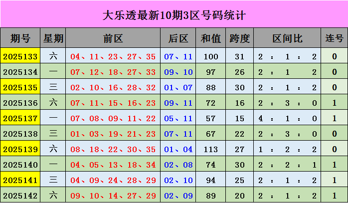 三区(25-35):上期奖号27、29,近10期出号较冷,出号13枚,从走势上看,出现三次断区,本期推荐:27