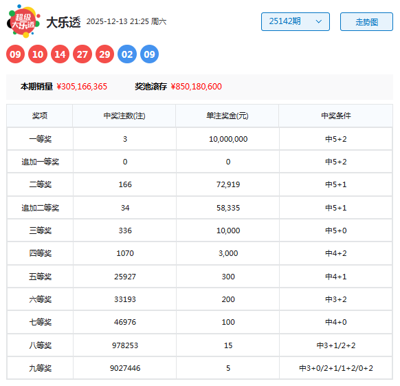 大乐透第25142期开奖。当期开奖号码为:前区09 10 14 27 29,后区02 09。当期前区号码大小比为2:3,奇偶比为3:2,三区比2:1:2;前区开出2枚重号09 29,开出1组连号09 10;后区开出小大组合02 09