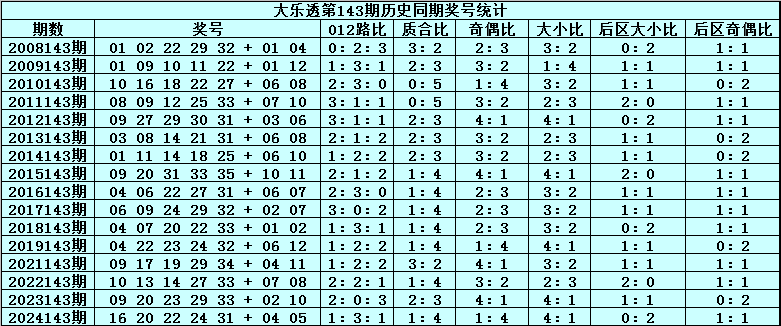 体彩大乐透第2025143期历史同期开奖号码分析: