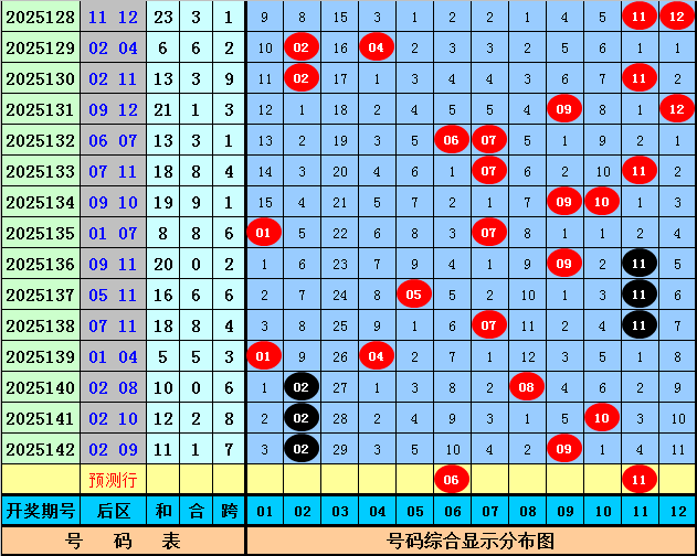 后区号码分析:第143期历史同期开奖中,后区两码一大一小开出9次,全大开出3次,全小开出4次,本期后区预计出现一大一小奖号,参考号码03、06、09、11。