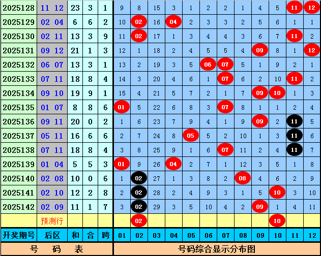 后区分析:在第143期历史同期开奖中,和值大小为8:8,跨度奇偶比为11:5,本期后区注意两码02和10。