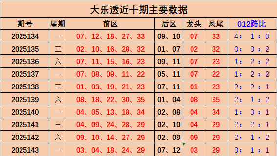大乐透上期开奖号前区为:03 04 18 24 29,后区07 12;012路比3:1:1,龙头开出03,凤尾开出29