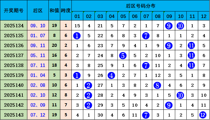 后区分析:上期后区开出07 12,跨度5,近十期跨度是:1、6、2、6、4、3、6、8、7、5,波动范围较大,跨度范围在1-8之间,本期预计跨度值下降,重点关注号码09 10,跨度1。
