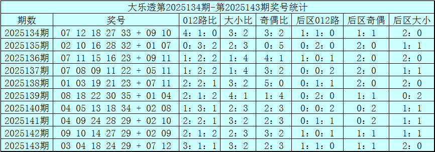 赵研大乐透第2025144期奖号012路分析: