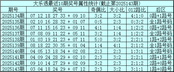 大乐透第2025143期开奖号码:03 04 18 24 29 + 07 12。前区奖号大小比为3:2,奇偶比为2:3,012路比为3:1:1,后区为1路+0路号。