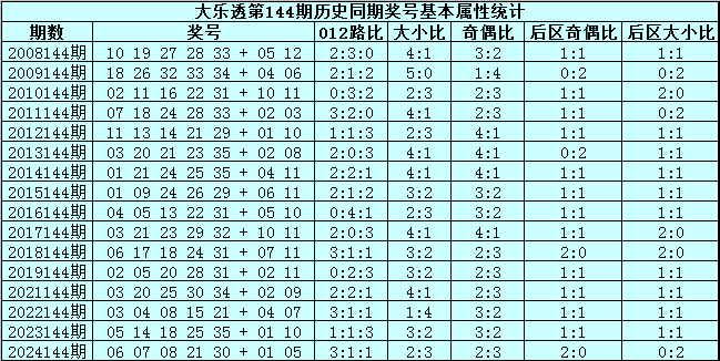 前区大小比推荐:第144期历史同期奖号中,号码大小比总比例为50:30,其中大小比0:5→0次、1:4→1次、2:3→4次、3:2→4次、4:1→6次、5:0→1次,开出比例较高,本期注意大号再次热出,关注大小比3:2。