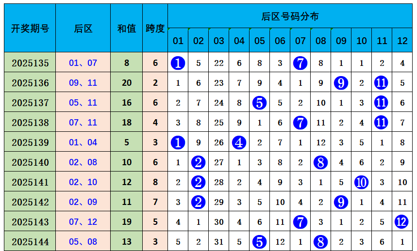 上期奖号开出05、08。最近10期开出大奖号13枚,小奖号7枚,大小比为13:7,本期预测开出大小比为1:1,推荐后区奖号:05、12。