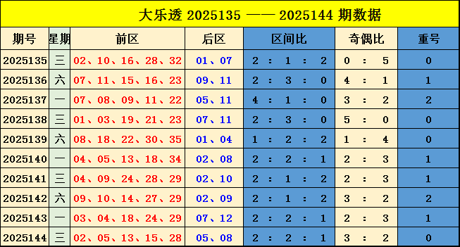 前区奇偶比分析:上期开出奇偶比3:2,最近10期奇偶比为25:25,奇偶数号码平出;近5期奇偶比为12:13,偶数号码走势占优;历史上前6次奇偶比3:2开出以后,其下期奇偶比分别开出4:1、3:2、4:1、0:5、5:0、2:3,其中奇数号码出现18个,偶数号码出现12个,奇数号码走势较热,本期关注偶数号码热出,推荐奇偶比2:3。