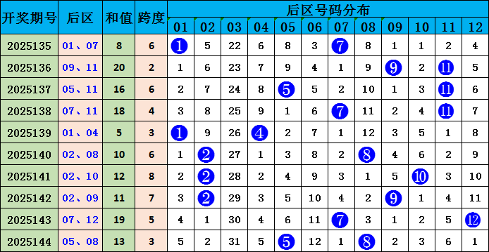 后区分析:上期开出小大奇偶组合05、08,前十期后区大小比为13:7,大数号码相对热出,其中小大组合占6期。本期预计小大组合出现,后区推荐号码05、12。