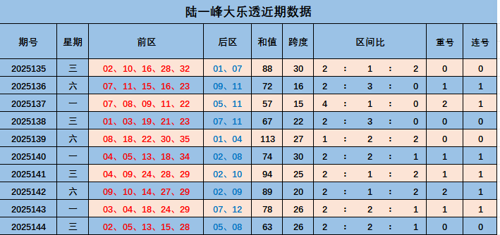 大乐透上期数据分析:前区02,05,13,15,28。后区05,08。前区和63,跨度26,区间2:2:1,没有开出重号。没有开出连号。