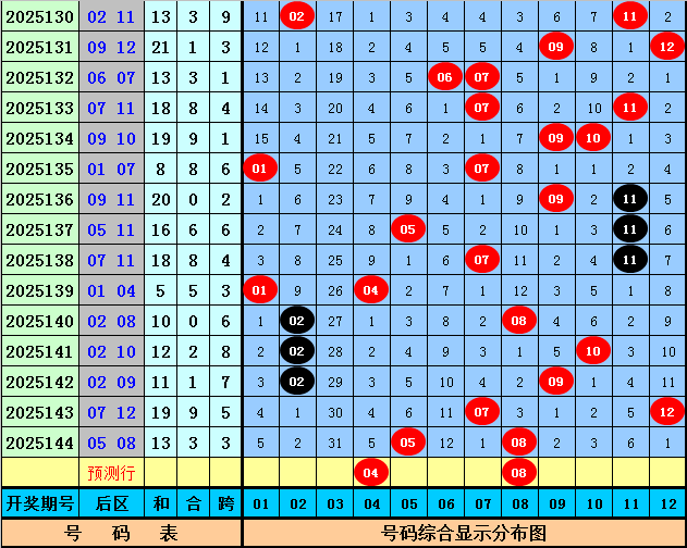 后区分析(一区01-04,二区05-08,三区09-12):上期后区开出奖号05和08,最近10期后区三区落号比为6:12:7,本期后区关注号码04、07、08、10、11,后区两码参考04、08。