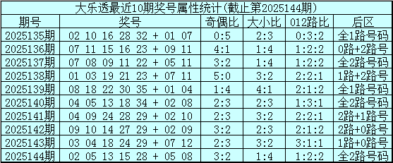 大乐透第2025144期开奖号码:02 05 13 15 28 + 05 08。前区奖号大小比为1:4,奇偶比为3:2,012路比为1:2:2,后区为全2路号码。