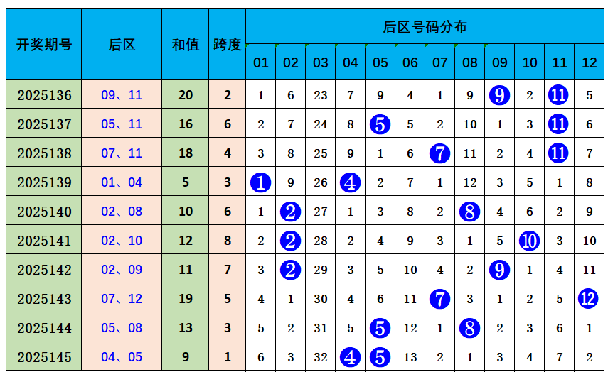 上期后区开出奖号04、05,奇偶比1:1,近10期奇偶比11:9,奇数奖号开出较多,本期推荐奇偶比1:1,参考后区号码05、06。