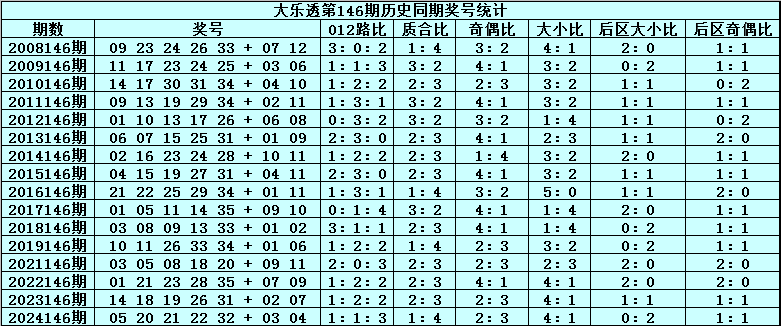 体彩大乐透第2025146期历史同期开奖号码分析: