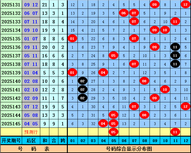 后区号码分析:第146期历史同期开奖中,后区两码一大一小开出7次,全大开出5次,全小开出4次,本期后区预计出现一大一小奖号,参考号码01、05、08、11。