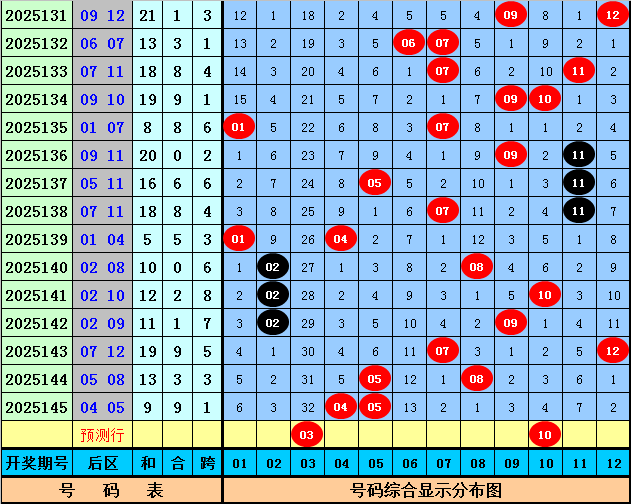 后区分析(一区01-04,二区05-08,三区09-12):上期后区开出奖号04和05,最近10期后区三区落号比为6:12:7,本期后区关注号码03、05、07、10、11,后区两码参考03、10。