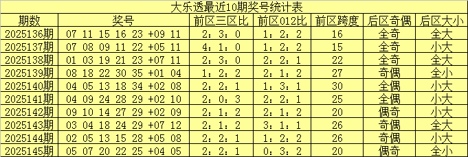大乐透第2025145期奖号开出:05 07 20 22 25 +04 05。其中前区三区比为2:2:1,012路比为0:3:2,后区开出全小、一奇一偶奖号。