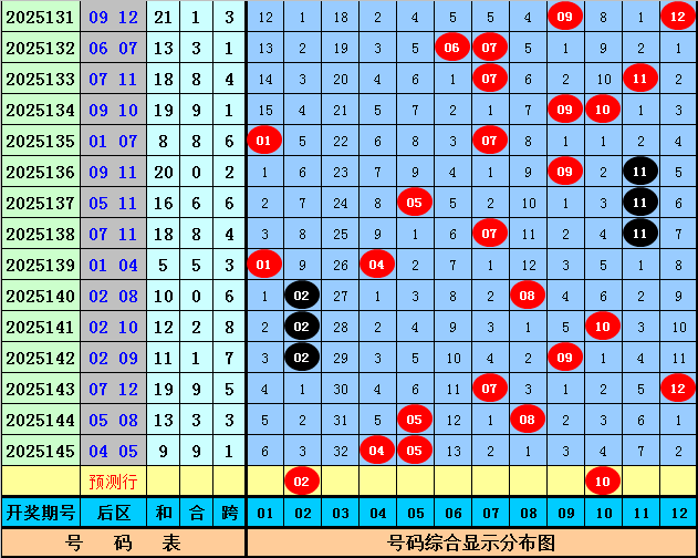 后区号码分析:在第146期历史同期开奖中奖,奖号11出现5次,奖号01 09出现4次,奖号02 04 06 07 10出现3次,奖号03出现2次,奖号08 12出现1次,奖号05没有出现。本期后区五码参考01、02、05、08、10。