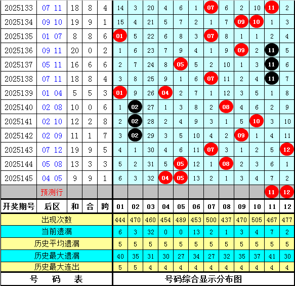 其中,后区奇偶比为15:25,大小比为20:20,012路比为7:16:15,本期后区金胆参考11。