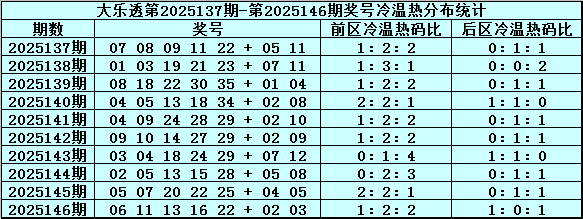 体彩大乐透第25146期奖号为:06 11 13 16 22+02 03,前区奖号奇偶比为2:3,012路比为1:3:1,大小比为1:4,遗漏总值为35,后区号码遗漏总值为35。